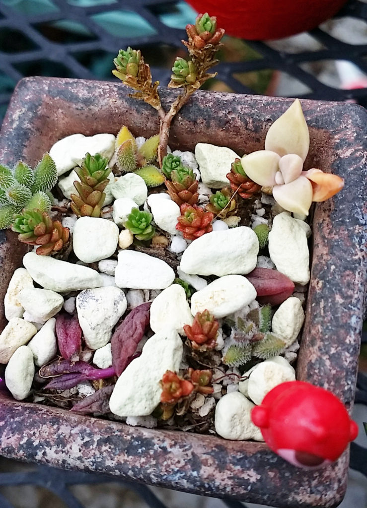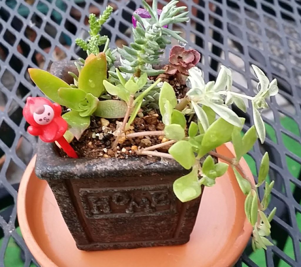 その頃はまだ多肉にはあまり興味がなく、たまたま多肉寄せ植えの店舗があったのでお土産もかねて購入しただけ。しかも閉店間際で苗もあまりなく(^-^;